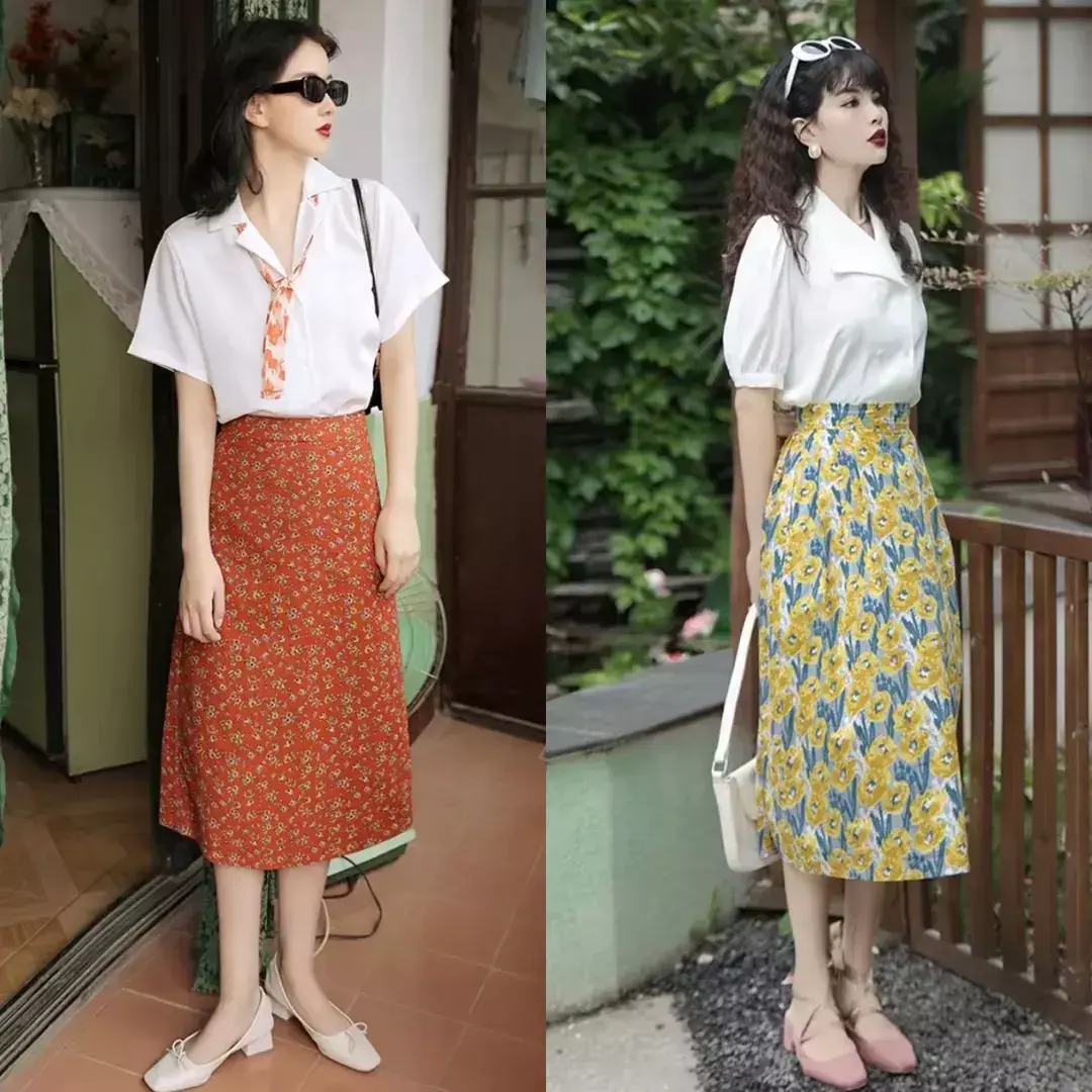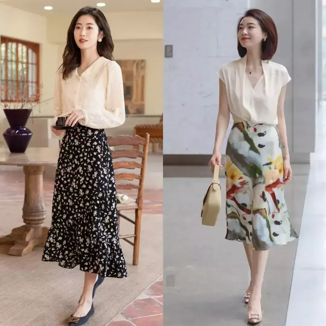例如下面这两身穿衣造型就是用了上紧下翻的搭配方法,一件杏色的衬衫上衣搭配上碎花的a字半身裙,或者是搭配上彩色印花的鱼尾裙,使得穿搭者简约干练,又能散发出女性的优雅感。