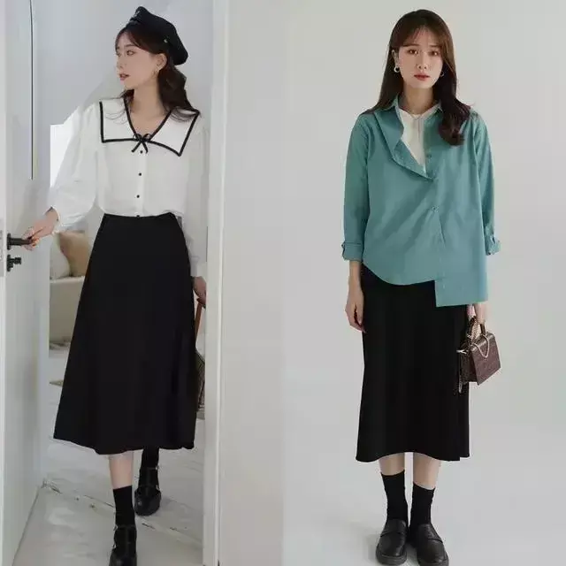 我们选择穿基础色的衣服,单品最为耐看,也降低出错率,略有白色的衬衫和黑色的a字,半身裙搭配就很经典,怎么穿都不会出错。