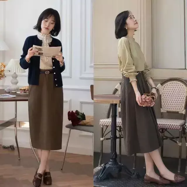 例如下面这一套穿衣造型,用藏蓝色的针织开衫,内搭杏色的木耳边立领衬衫,下半身选择咖色的直筒半身裙,彩的棕色的乐福鞋,这样的穿衣造型就温柔大方。