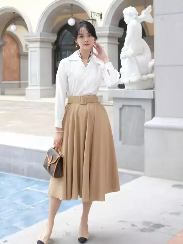 下面这一件白色的衬衫和卡其色的半身裙的面料就非常的挺阔有型,上身之后能够轻松的提升整个人的气质,变得更加好看。
