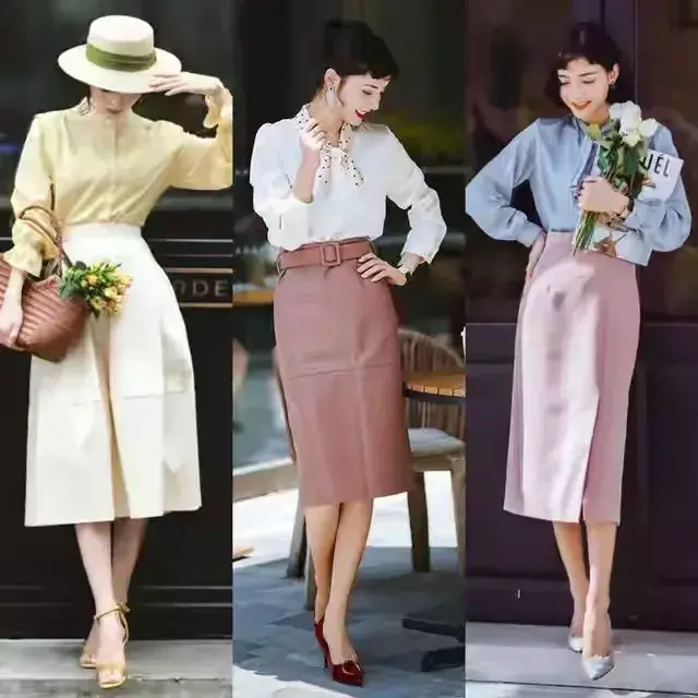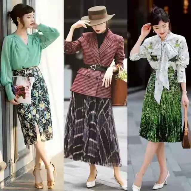 但是反过来说,如果是在奔四奔五的中年女性,腿型粗胯宽,腰间有赘肉,身材有所走样的情况下,尽量选择长款的半身裙盖过,膝盖长度到小腿位置,露出脚踝会更得体大方。