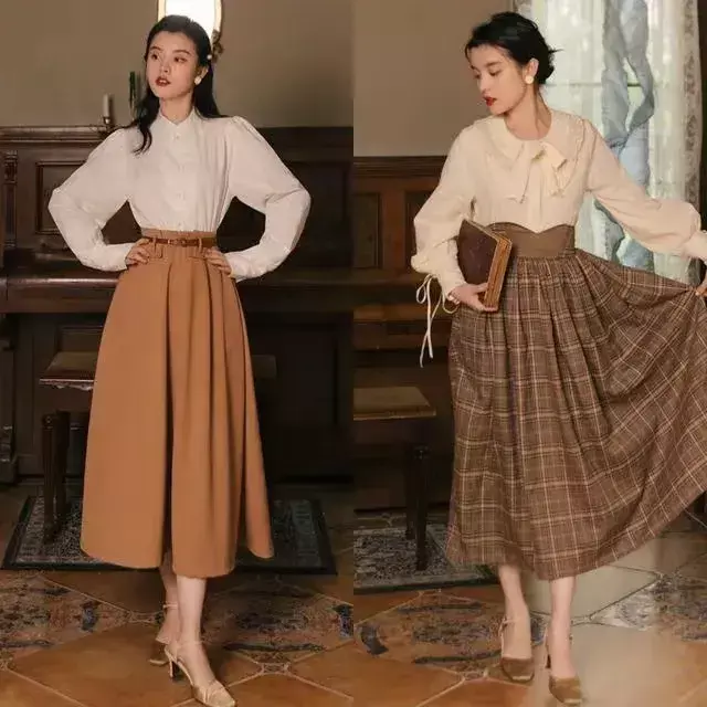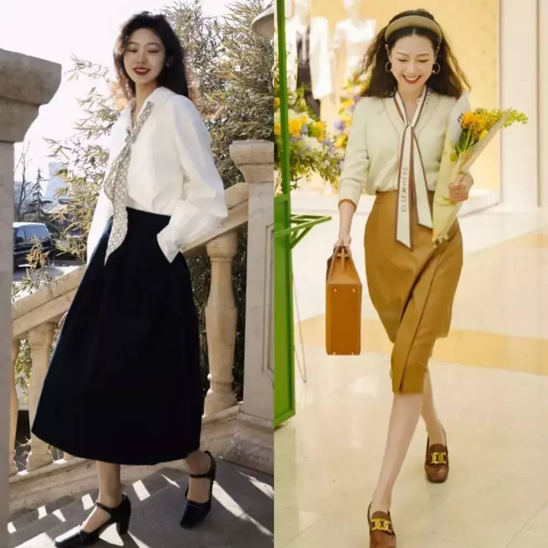 当然,你还可以选择另一套有蝴蝶结设计的领口搭配上格纹的伞状半身裙,脚上踩着一双浅口的粗跟单鞋,这样的搭配精致又洋气。