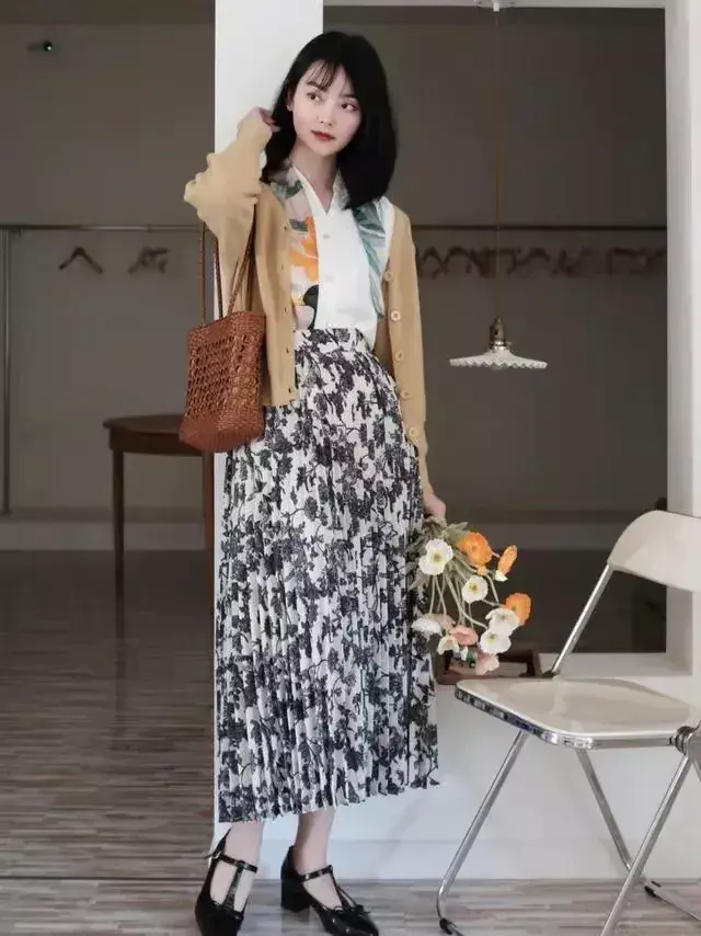这一身穿衣造型就利用了这样的搭配技巧,上简下繁,纯色系列的衬衫上衣或者是针织开衫搭配上印花的半身裙,把繁琐的衣服单品放在下半身,你的视觉中心就会往下移,这种情况下整个穿衣造型就不会显得凌乱,而且给人的视觉效果很精致时髦。