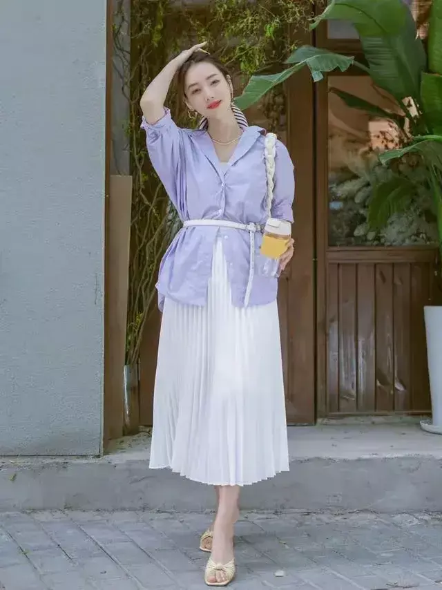 不同颜色的衣服单面组合在一块会比单一的色调更好看,更出彩,下面这位博主就选择了紫色的衬衫上衣,搭配上白色的百褶半身裙,腰间在勒上白色的小腰带,优雅大气又很时髦,这样的一身穿搭造型就属于撞色搭配,层次感分明。