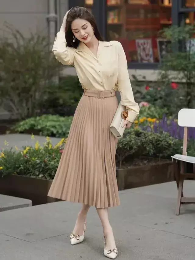 浅黄色的衬衫比较修饰,肤色显白又显嫩,和一款浅棕色的百褶半身裙进行组合搭配,散发出了成熟女性的魅力,得体大方。