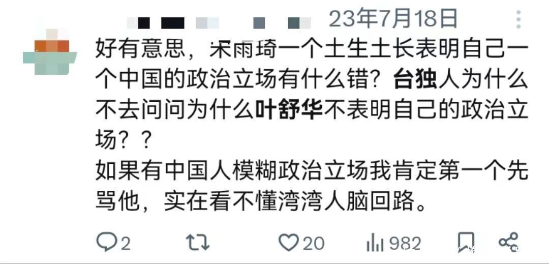 我们可以看到,网友们在提到叶舒华的时候总会提起自己同一个队伍的成员宋雨琦。明明两位都是中国人,为什么宋雨琦可以公开明确表示自己的立场,而叶舒华总是模糊立场,甚至做出一些令人匪夷所思的事情。