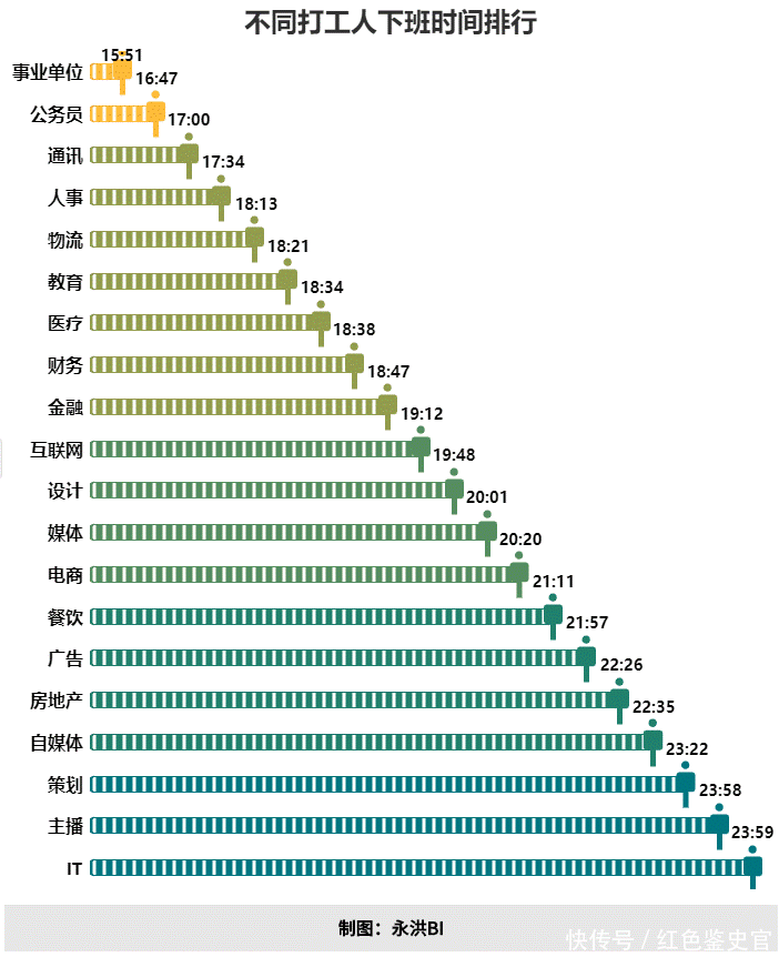 看看这张不同职业打工人的下班时间,很明显能看到跟网络相关的职业加班到晚上11点都是再正常不过了