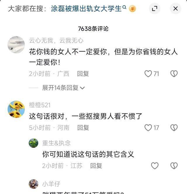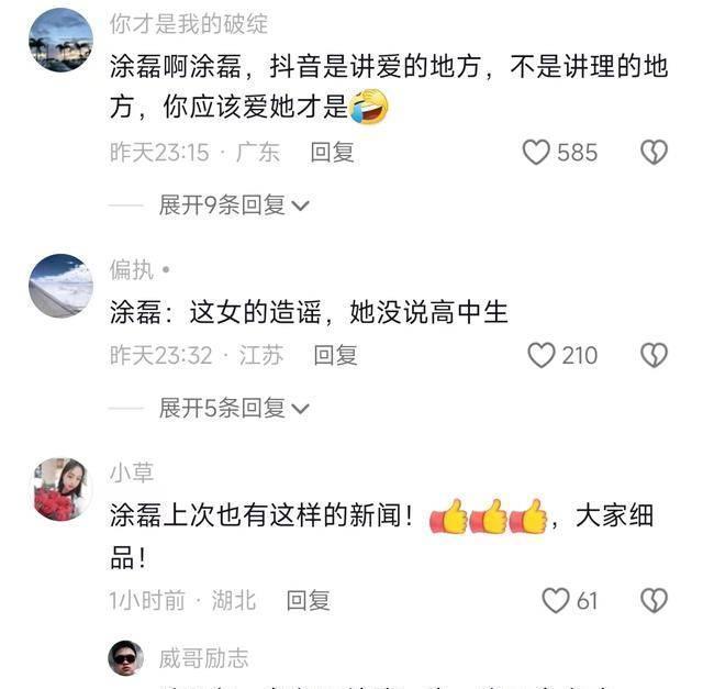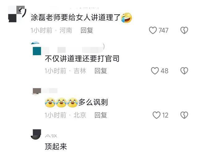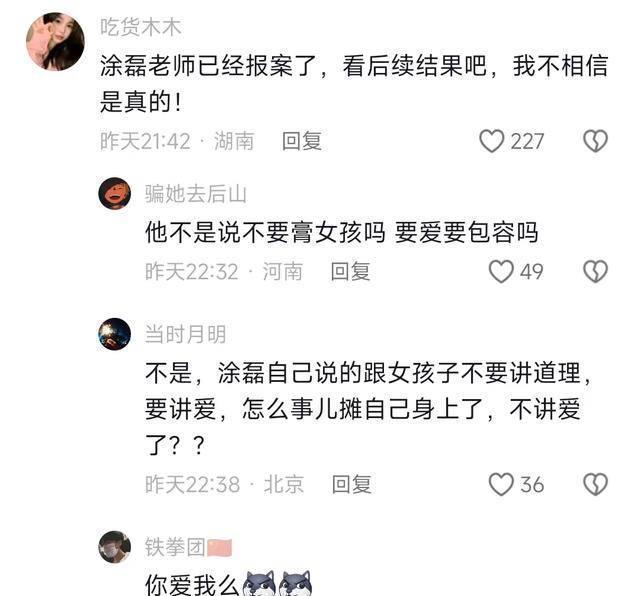 一名女博主声称是涂磊的邻居,说他天天玩00后女大学生,这件事在网上很快发酵和传播,涂磊也很快回应会追究告到底。即便知道这很可能是小作文,很可能没证据,但他并没有被同情,反而被人模仿他曾经的语录群嘲。
