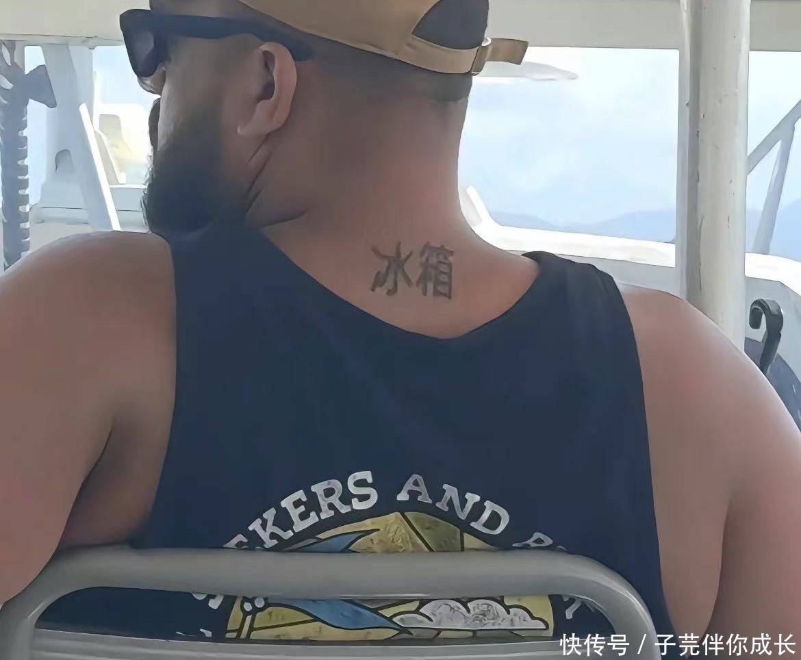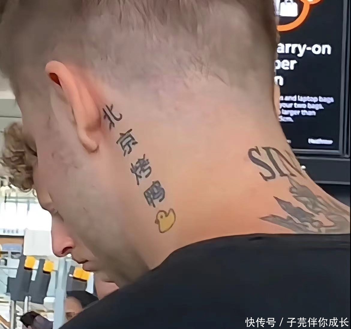 下面这位小哥,看起来身材魁梧,但一看就不懂中文,被纹身师给耍了,脖子上印着那么两个字,让旁边小伙看了很犹豫,不知道该不该说实话。