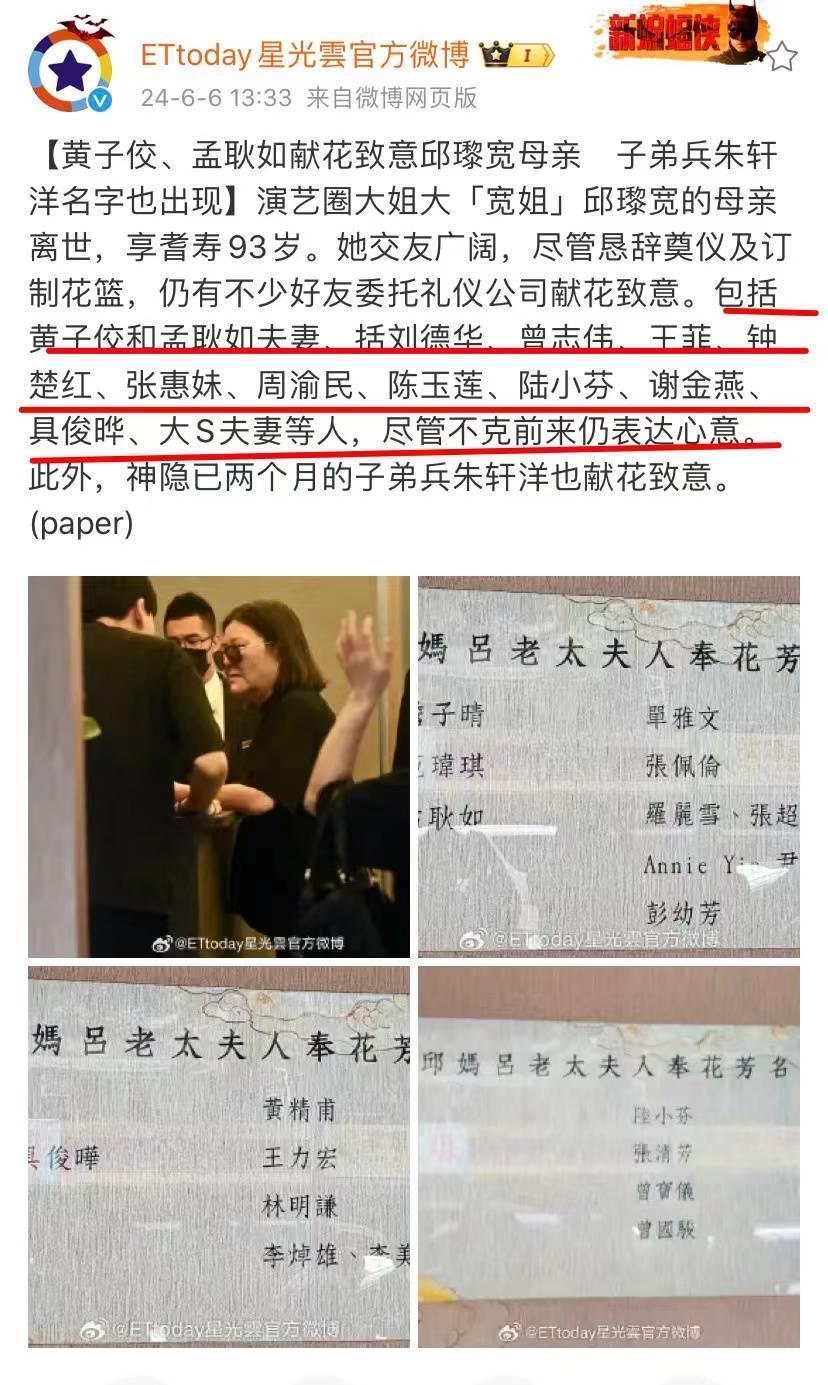 据悉深陷社会舆论的黄子佼和孟耿如夫妇也献花致意宽姐母亲,很多好友委托礼仪公司献花致意。包括黄子佼和孟耿如夫妇、刘德华、曾志伟、王菲、钟楚红、张惠妹、周渝民、陈玉莲、陆小芬、谢金燕、具俊晔和大S夫妻等。尽管没有亲临现场但仍表达心意。