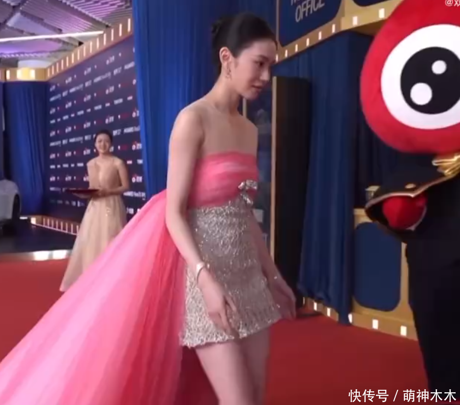 作为“谋女郎”现身电影之夜的刘浩存穿着很是少女,粉嫩十足。但因为裙摆太大,走路的时候缀在身后,感觉刘浩存都有些负重前行的感觉,体态有些佝偻,刘浩存整理裙摆的时候也是非常狼狈。