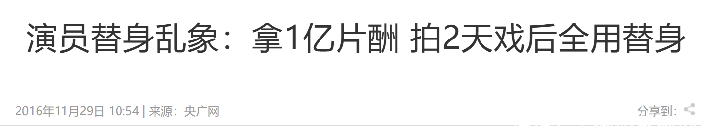 演员替身乱象:拿1亿片酬 拍2天戏后全用替身=2016年11月29日 10:54|来源:央广网