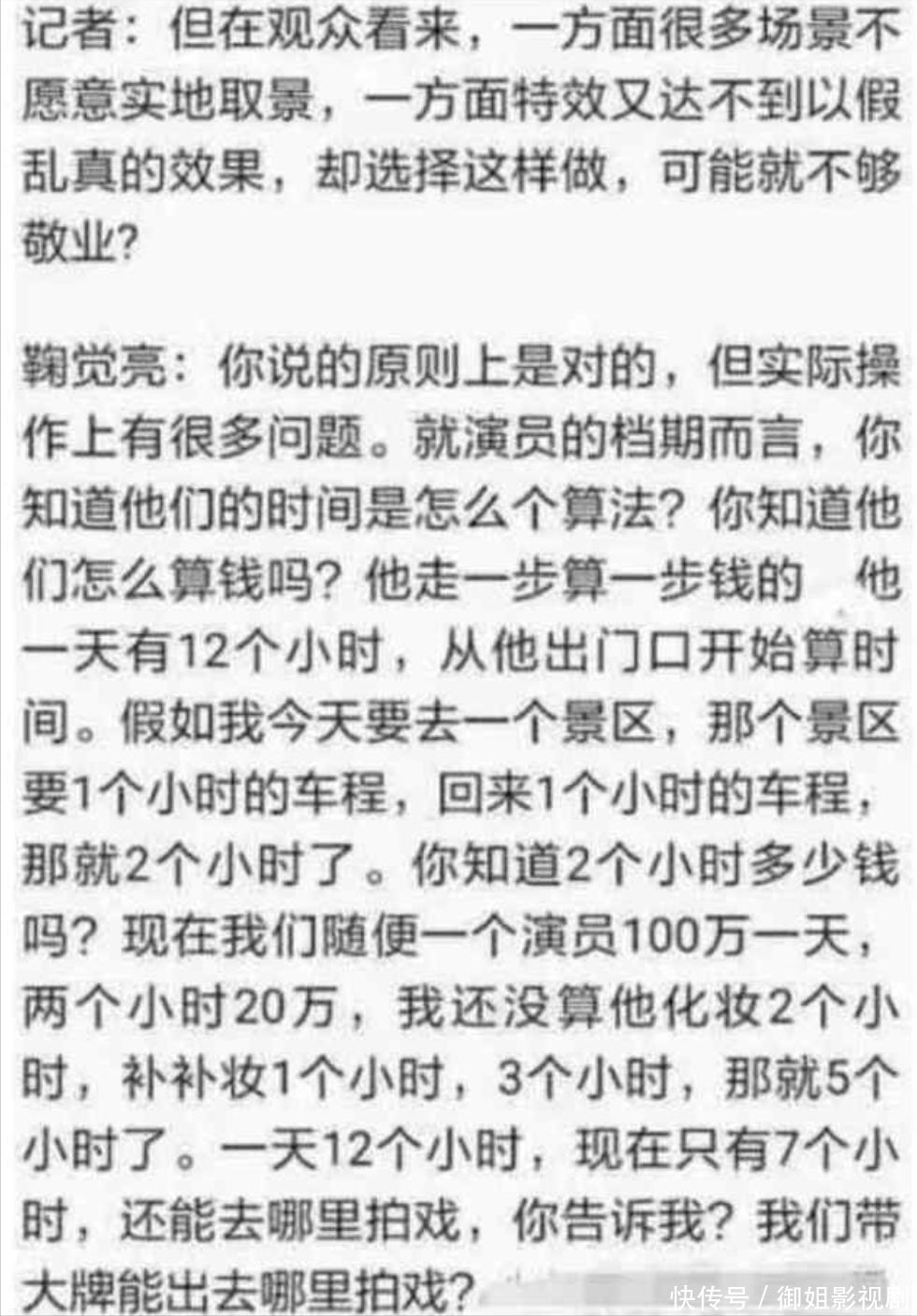 导演也说出了许多行业的内幕,不仅是现在的新生代演员太贵,普通剧组根本拿不出那么多钱,甚至有的拍戏是按照小时算的,并且是从踏进剧组的那一刻起就已经在片酬计算的时间内了,甚至化妆、路程、换服装的时间都计算在内等都计入在内。