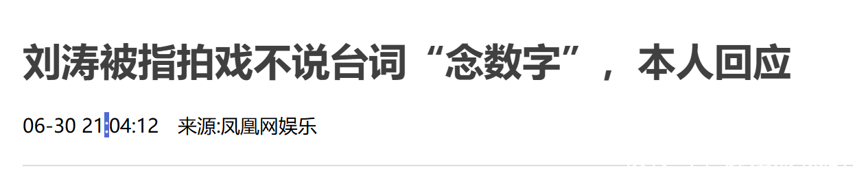 演员刘涛就曾曝光过,在她拍戏时还真遇到过这样的演员,刘涛在认真的念台词时,而这位演员就用数字代替台词拍完了一整场戏,甚至老演员李雪健也曾遇到过这种“数字小姐”,这不禁让人疑惑,现在的新生代演员已经狂妄自大到这种地步了么?面对这些可以当他们老师的老戏骨也用这样敷衍的态度对待?