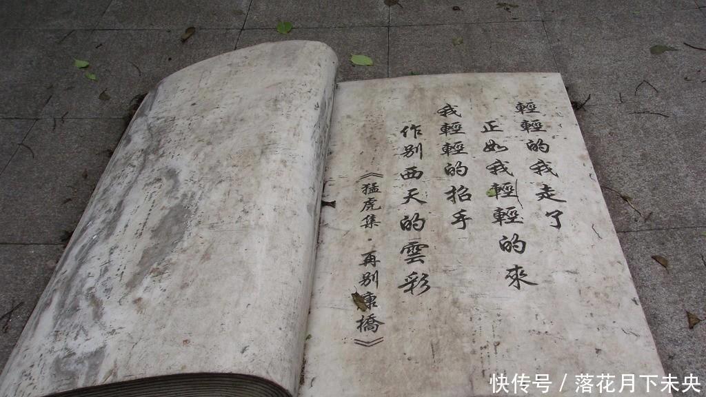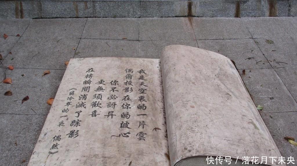 【书本雕刻(左侧)】徐志摩墓的两侧各有一个翻开的书形雕塑,左侧刻有《偶然》,“我是天空里的一片云,偶尔投影在你的波心,你不必讶异,更无须欢喜,在转瞬间消灭了踪迹”;右边为《再别康桥》的诗句,“轻轻的我走了,正如我轻轻的来;我轻轻的招手,作别西天的云彩。”