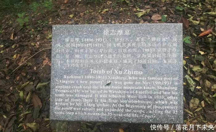 【徐志摩墓地正面照】徐志摩去世后墓地有过多次修缮,原来下葬浙江海宁东山玛瑙谷万石窝,特殊时期被毁坏。1983年,海宁当地政府重建徐志摩墓,改建在西山公园,是一座衣冠冢。徐志摩失事到葬礼结束,陆小曼没有出现(徐家不允许她参加),但是一年后清明节她独自去扫墓了。