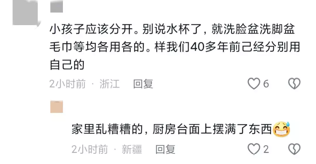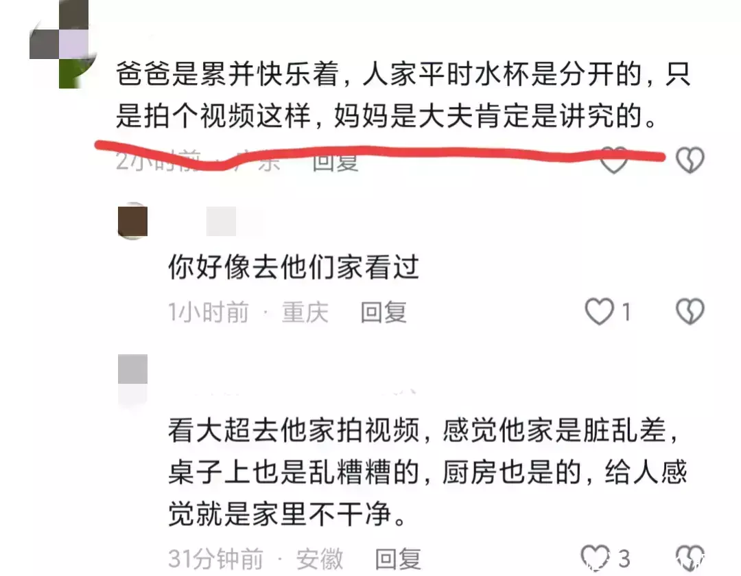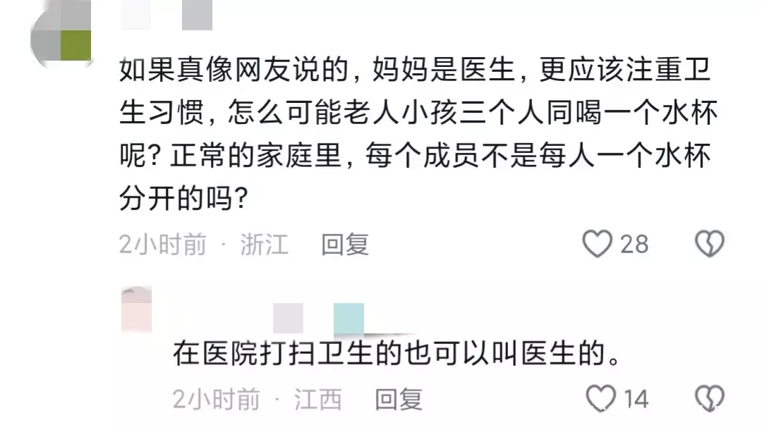 因为一家三口共用一个水杯,网友们差点吵架。有的网友称天赐的妈妈是大夫,肯定很讲究卫生。