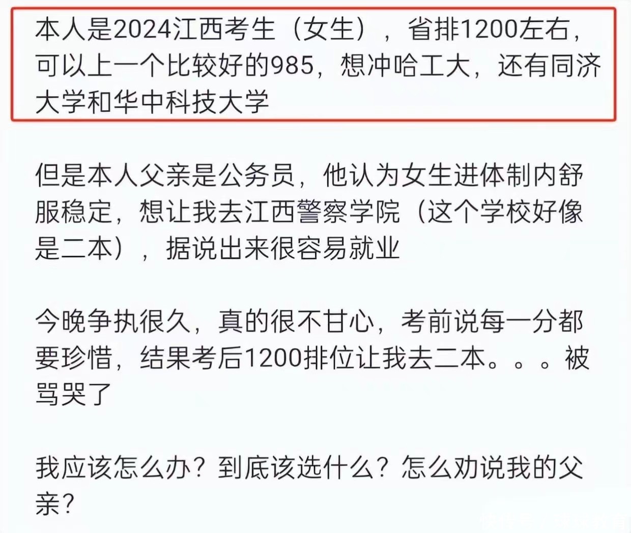 高考省排1200名,父亲逼女儿上二本警校,孩子想上985反被骂哭