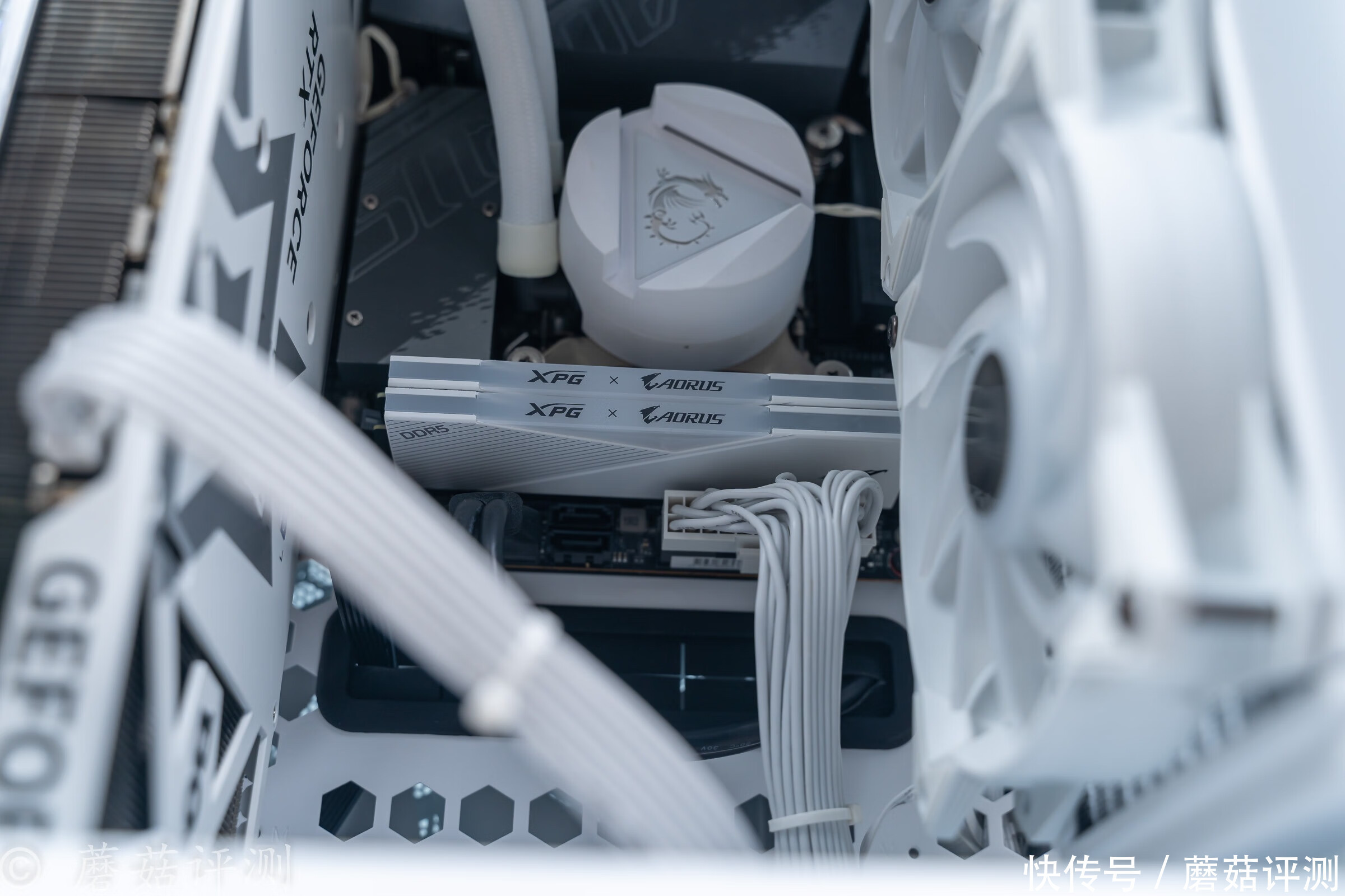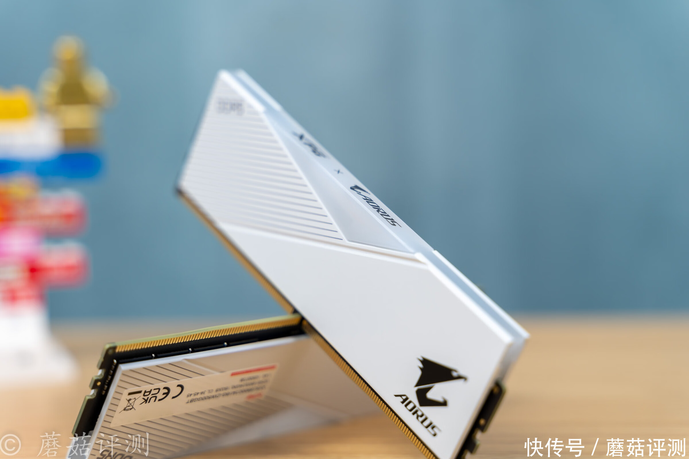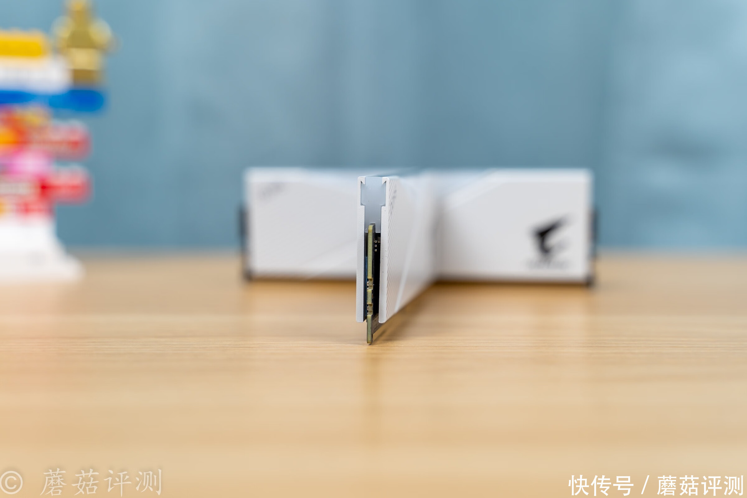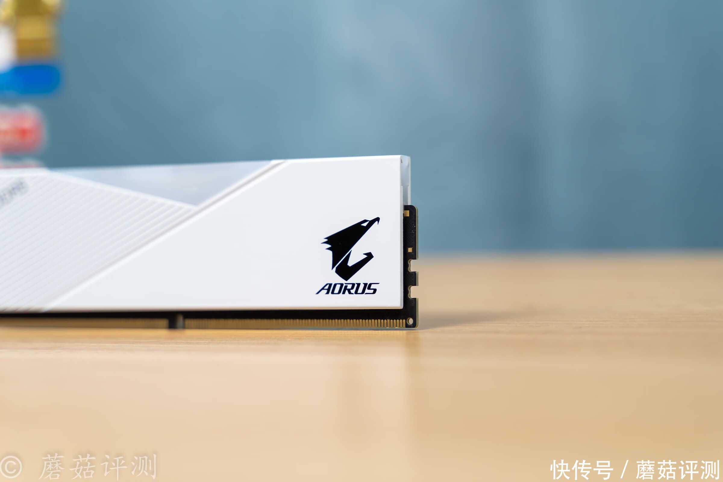 ▼稍微换个角度,内存条RGB灯带中间黑色的XPG的LOGO和技嘉的AORUS雕牌LOGO非常显眼,黑色的。