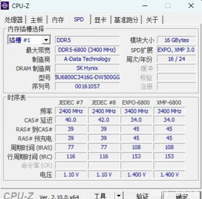 ▼简单看下这套内存的参数,其颗粒不出所料的是海力士的,支持EXPO和XMP 3.0,基础频率4800MHz,一档频率6800MHz,时序34-45-45-108,电压1.4V,表现不错。