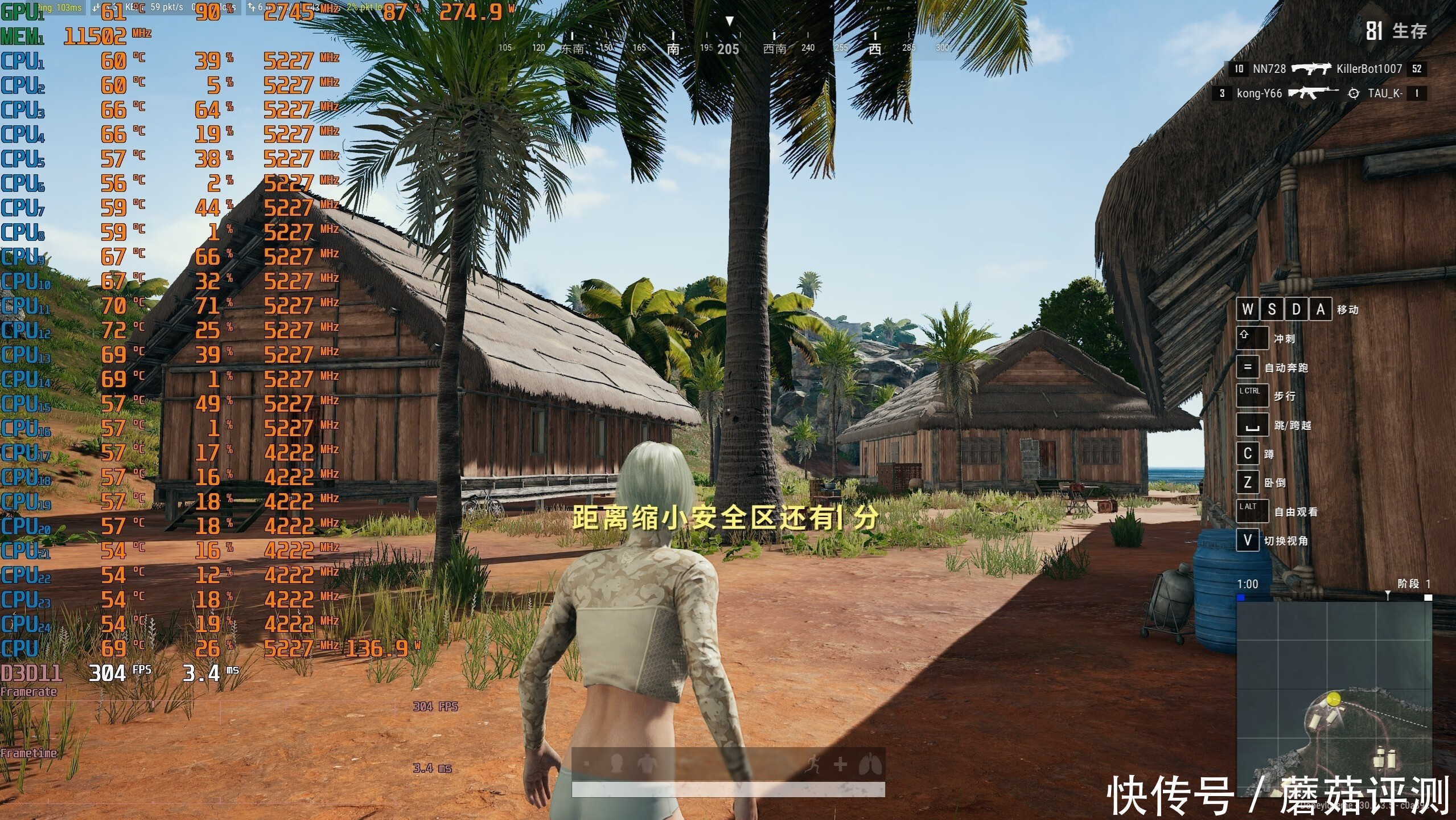 ▼再次进入绝地求生PUBG,2K分辨率,全高画质,室外游戏帧数在304帧左右,相比较默频提升明显。