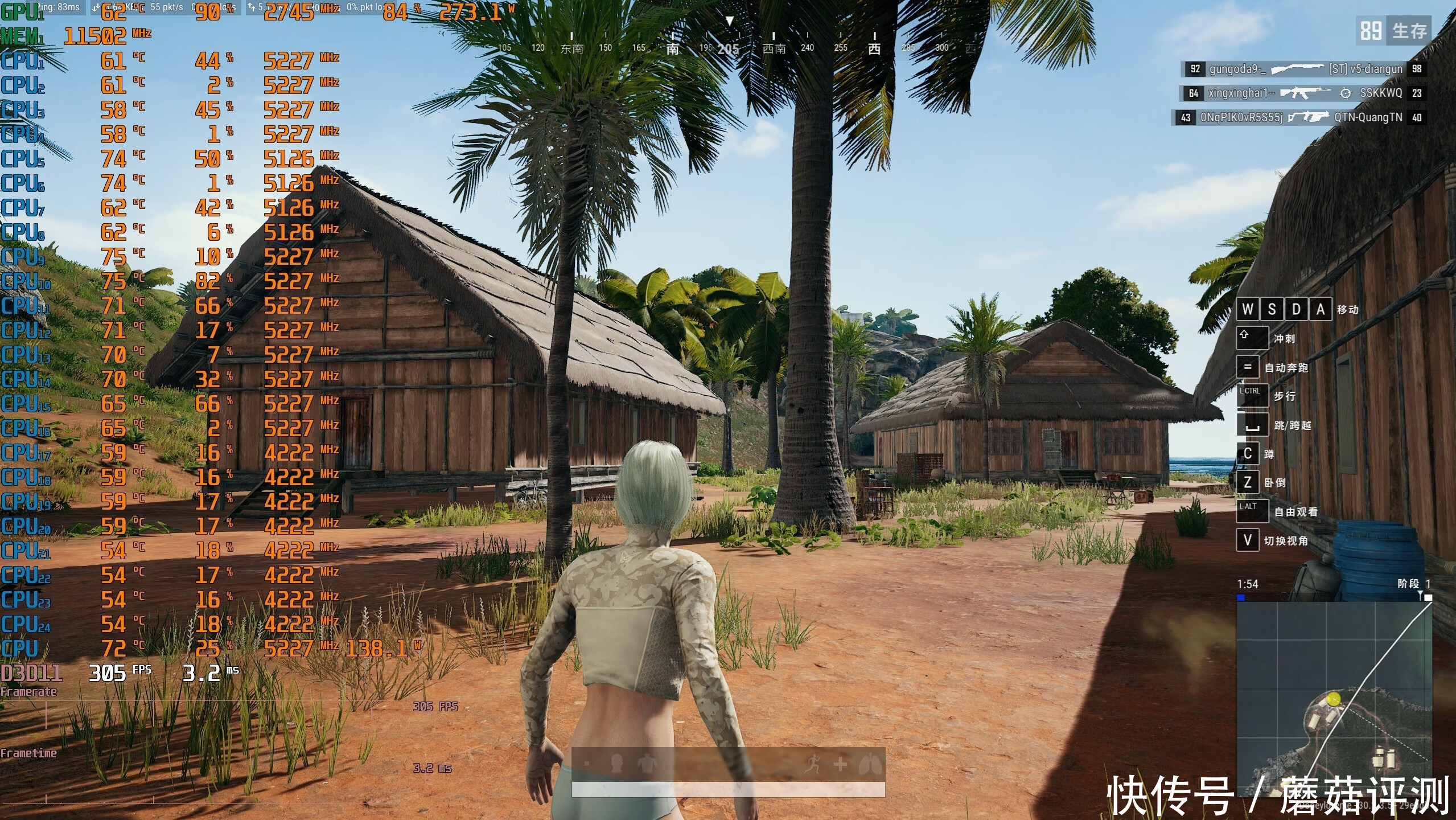 ▼同样绝地求生PUBG,同样的2K分辨率、全高画质,室外游戏帧数稳定在305帧左右。内存的读写性能提升明显,但游戏帧数提升很微小了,熟悉的边际递减效应。