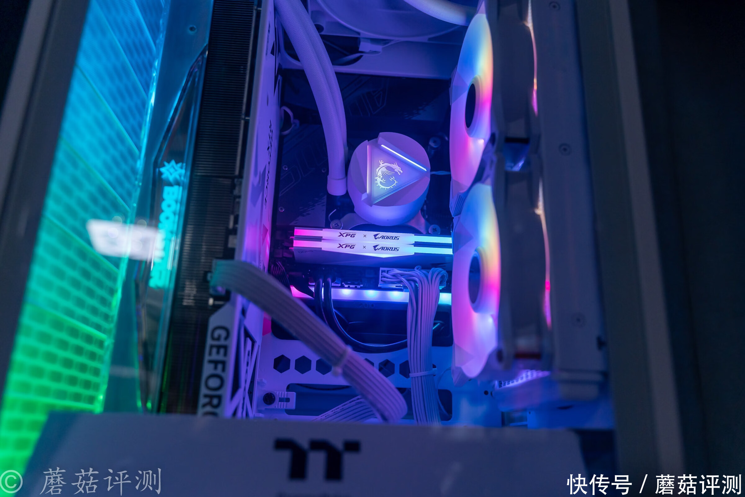 ▼机箱内部的RGB灯效还是蛮漂亮的,包括主板的侧面,也标配有多颗贴片LED,而且其RGB灯效的颜色和内存条的RGB灯带是一样的,呼应上了。