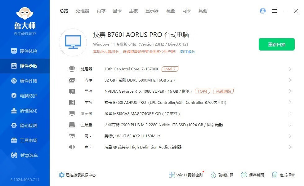 ▼整机配置一览,处理器是13700K,主板是技嘉的B760I AORUS PRO迷你雕,内存是威刚XPG的这款D500G技嘉联名白曜雕内存。