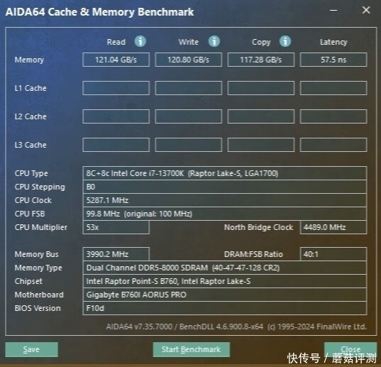 ▼简单跑个内存的读写测试,内存的读取速度直接去到了121GB/s、写入速度在120GB/s、复制速度在117GB/s,延迟在57.5ns,整体表现非常不错。