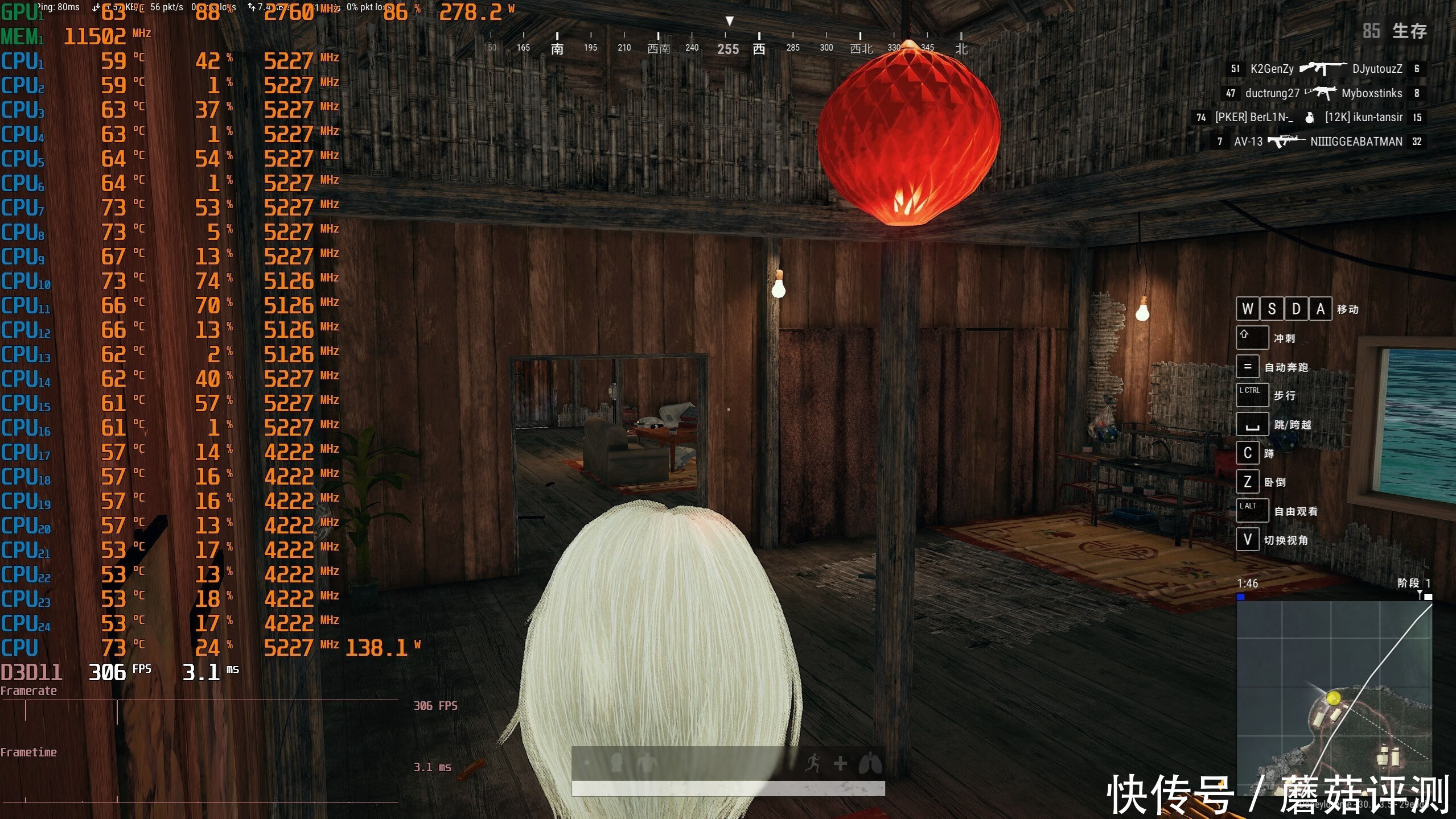 ▼室内游戏帧数反而提升略高一点,在306帧左右,表现不错。