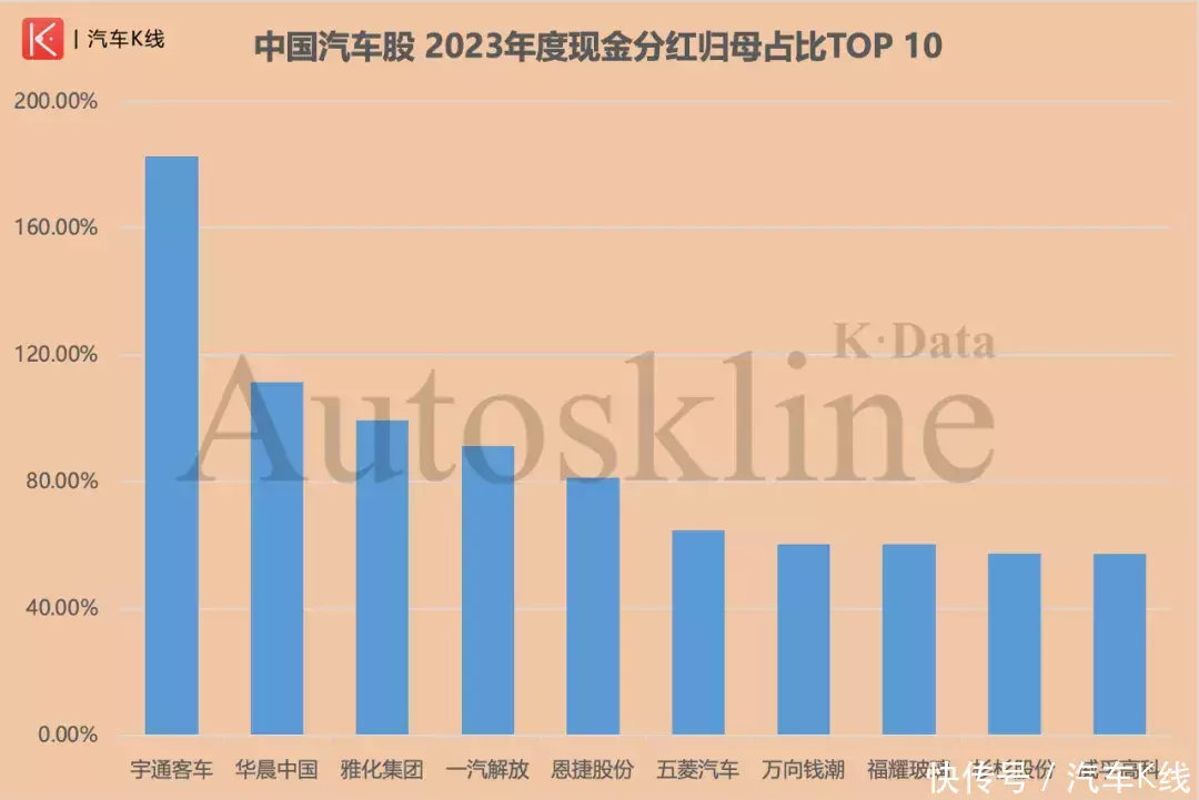 在《汽车K线》统计的2023中国汽车股分红排名中,华晨中国分红资金规模位列第3位,不过,与分红规模更高的宁德时代、比亚迪相比,华晨中国分红总额超越了2023年公司归母净利润,占比达到了111.47%。有着同样情况的另一家汽车股——宇通客车,其占比更是高达182.76%,而且回看近几年,从2019年开始,宇通客车就持续存在分红总额超过当年归母净利润的情况。与一年前相比,宇通客车排名下降一个名次,排在第2位。