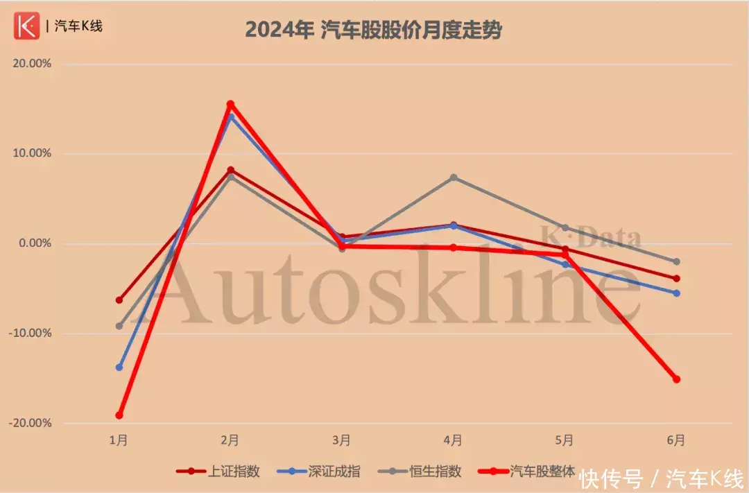 很多人一定都还记得2023上半年,上证指数站稳3000点后稳步上升。而一年后的今天,上证指数接连失守3000点大关,深证成指也跌破了8900点关口。三大股指中,唯一实现逆势翻盘的只有恒生指数,由去年同期的下跌4.37%,止跌回升为上涨3.94%。但由于在汽车股范围内,港股上市公司占比仅有3成左右,且多为出现下滑的造车新势力、经销商,所以恒生指数的回暖,并没能扭转汽车股整体下跌的颓势。