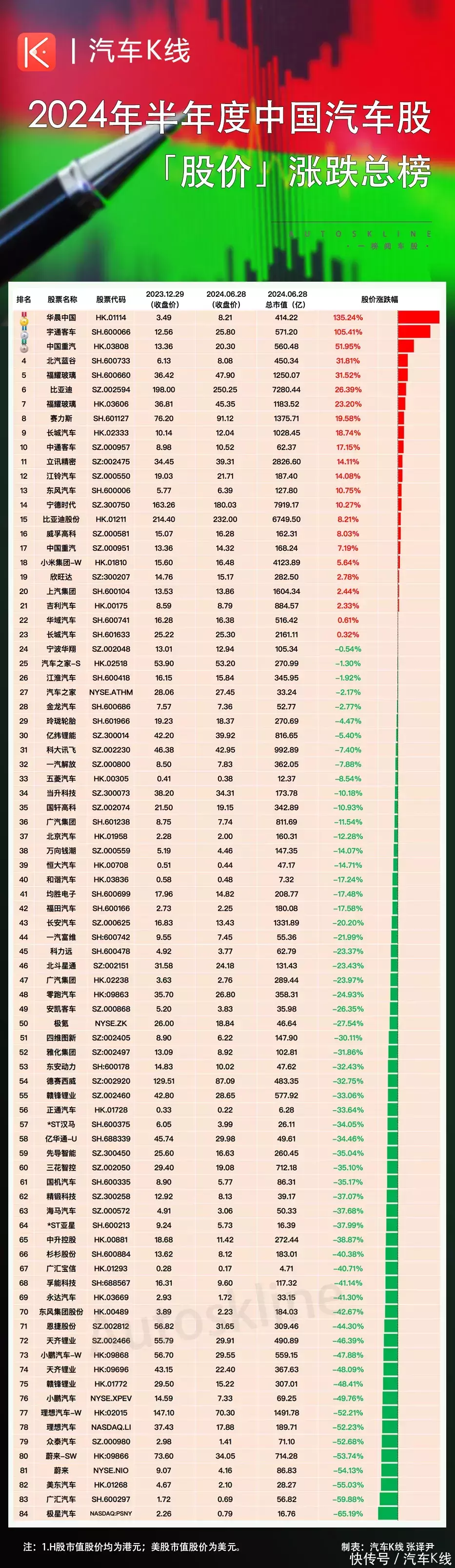 聚焦个股,与一年前最大的两个变化是,在造车新势力阵营中,除新增的小米集团外,其余上市公司股价在2024上半年全面出现下滑;不变的是,经销商集团个股再一次登上绿榜、领涨红榜的两只个股,仍然有着“一技之长”。