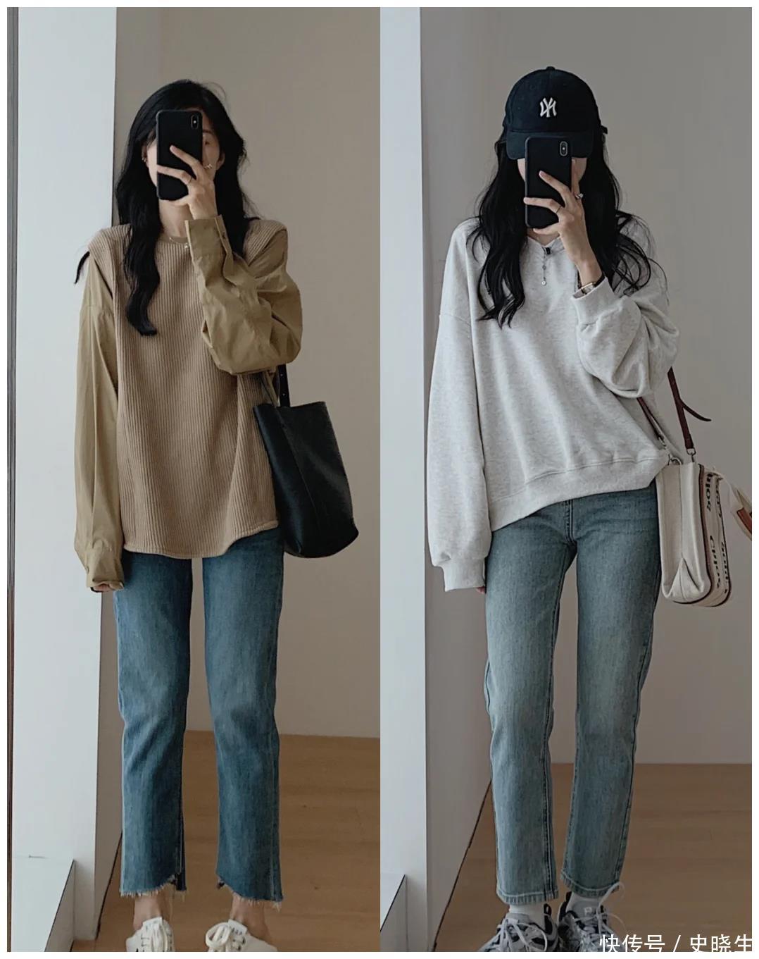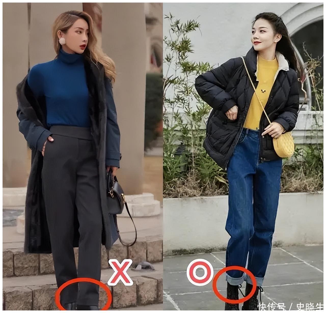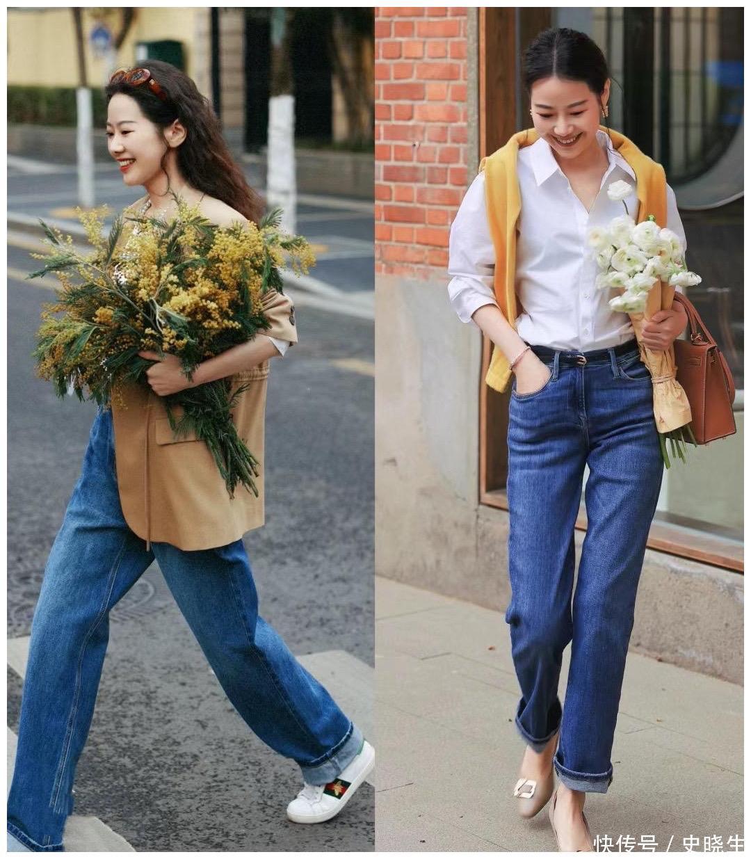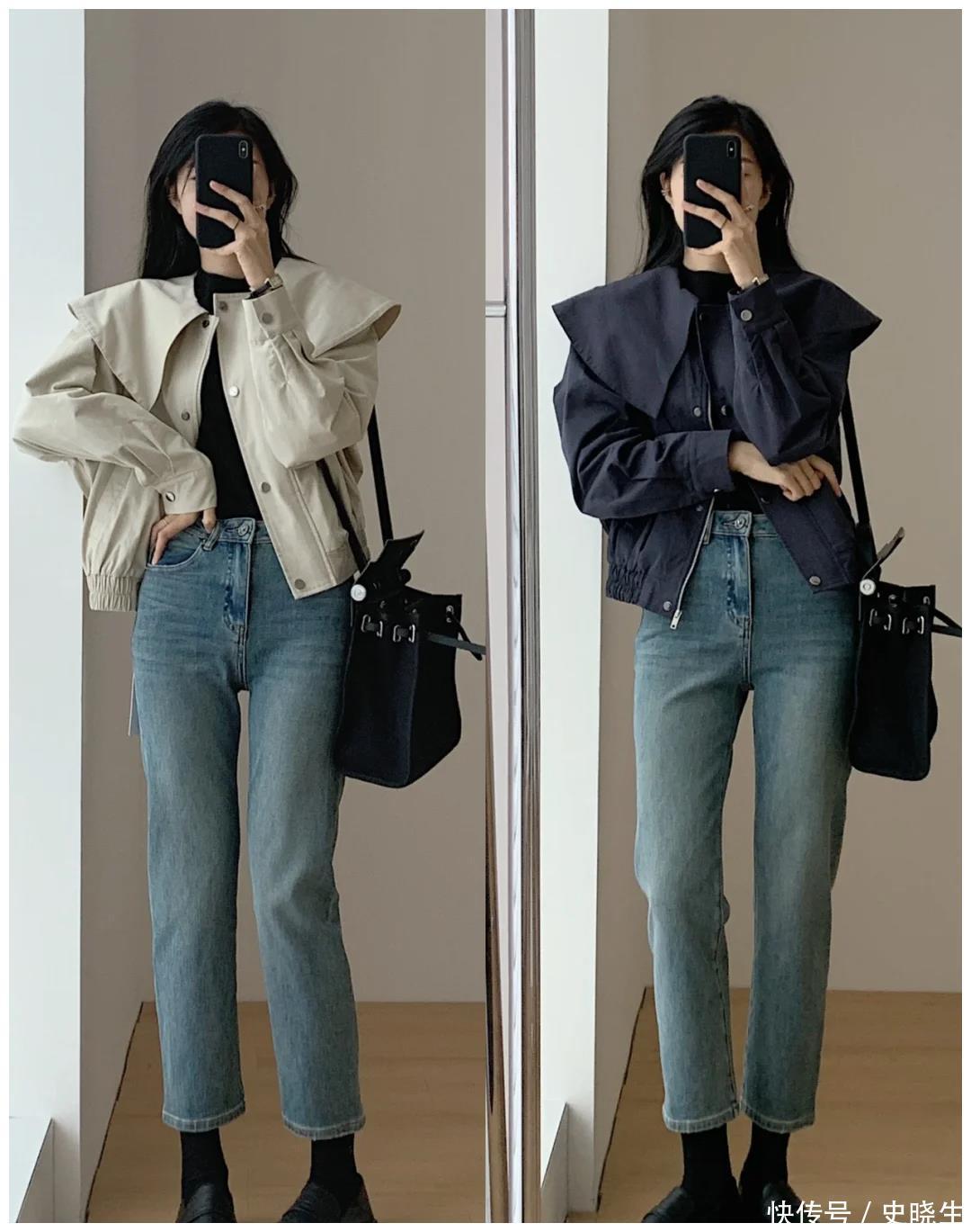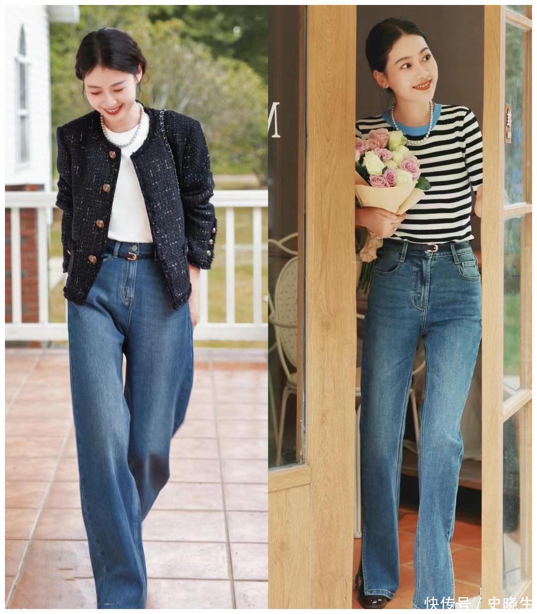 如果你想要穿得更加时髦一些,可以选择一些有设计感的直筒裤,直筒裤的版型不一样,穿搭出来的效果也不一样,大家看下面对比图片就能看出来。这些小细节可以让你的穿搭更加有趣,也可以让你看起来更加时尚。