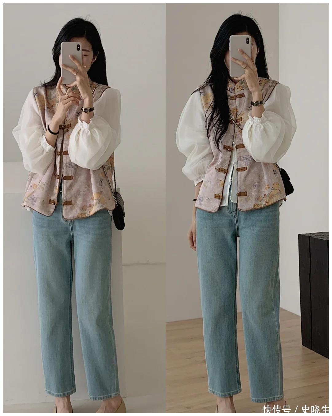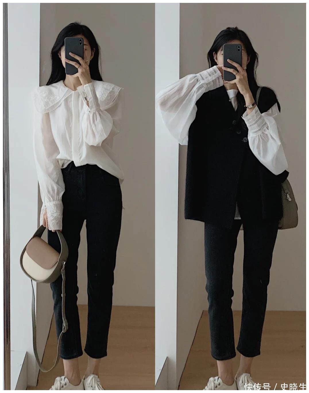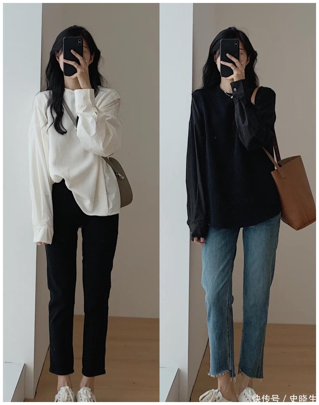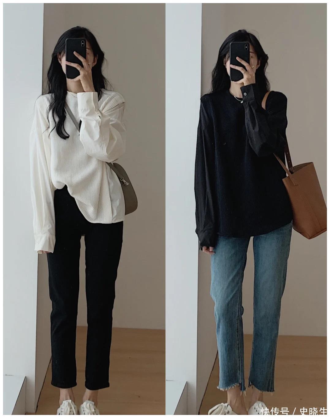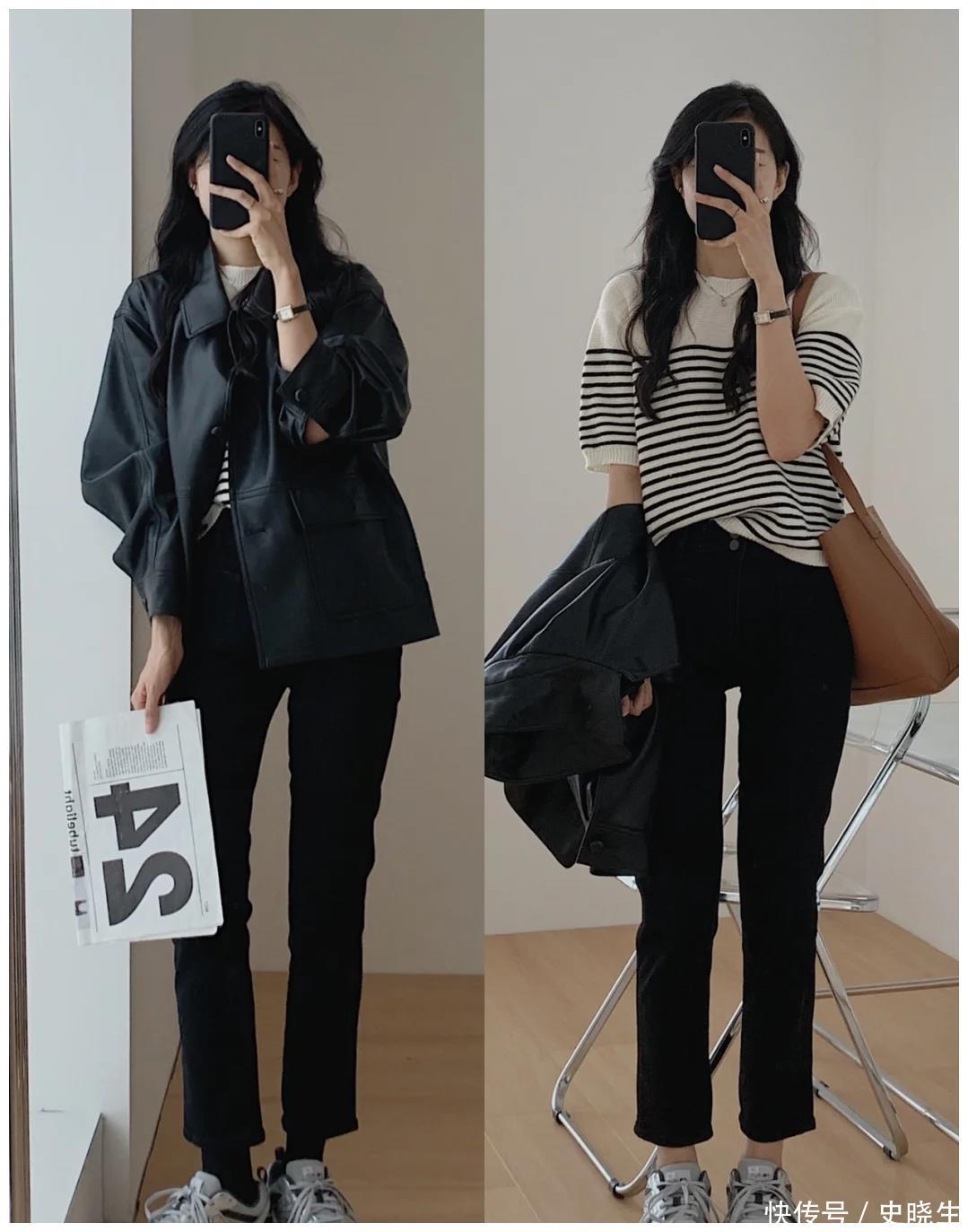如果你想要穿得更加时髦一些,可以选择一些有设计感的直筒裤,直筒裤的版型不一样,穿搭出来的效果也不一样,大家看下面对比图片就能看出来。这些小细节可以让你的穿搭更加有趣,也可以让你看起来更加时尚。