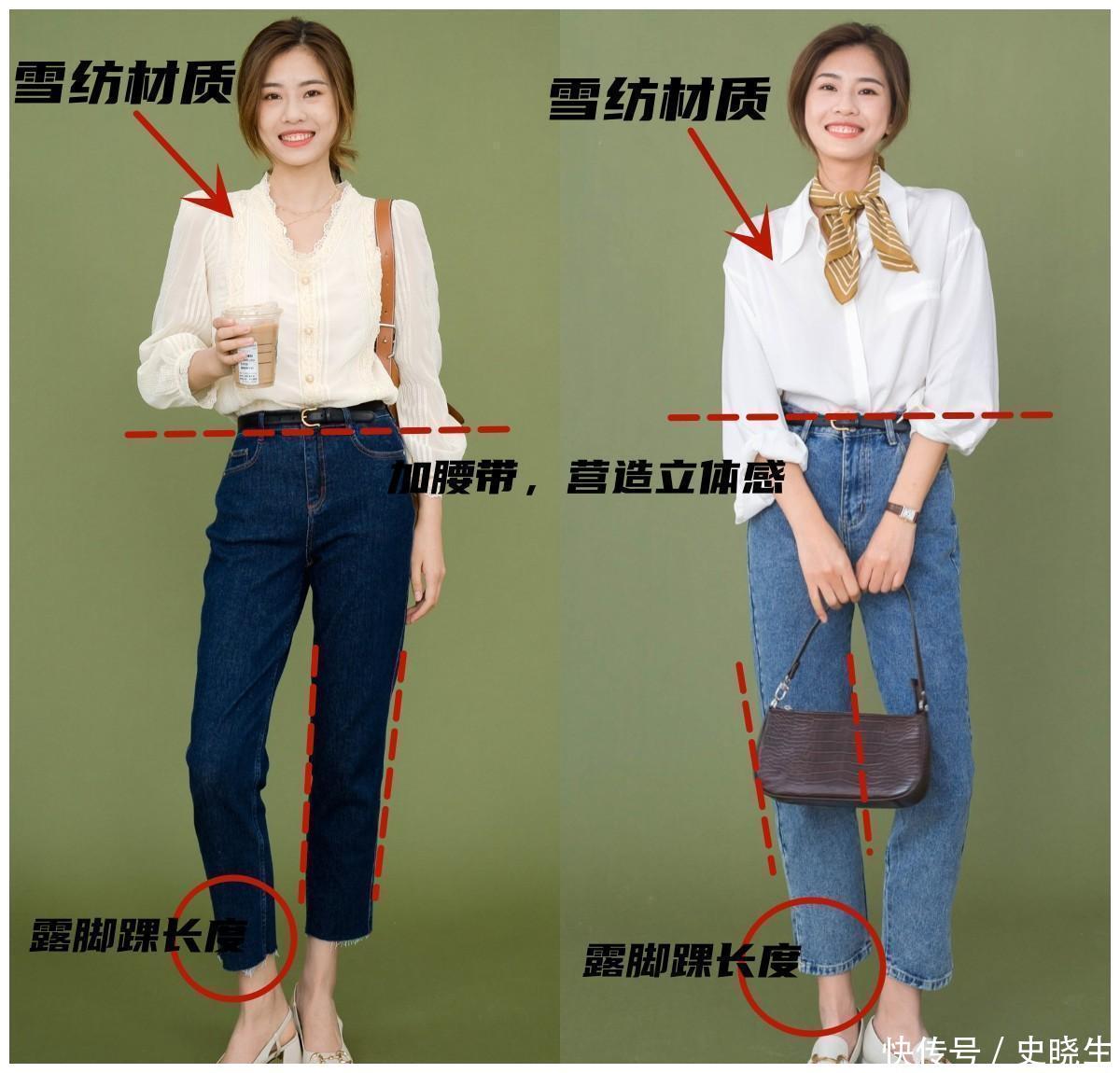 你可以像博主的穿搭示范一样,把衬衫塞进裤子里面,勒上腰带就能提升你的腰线比例,显高又显瘦。