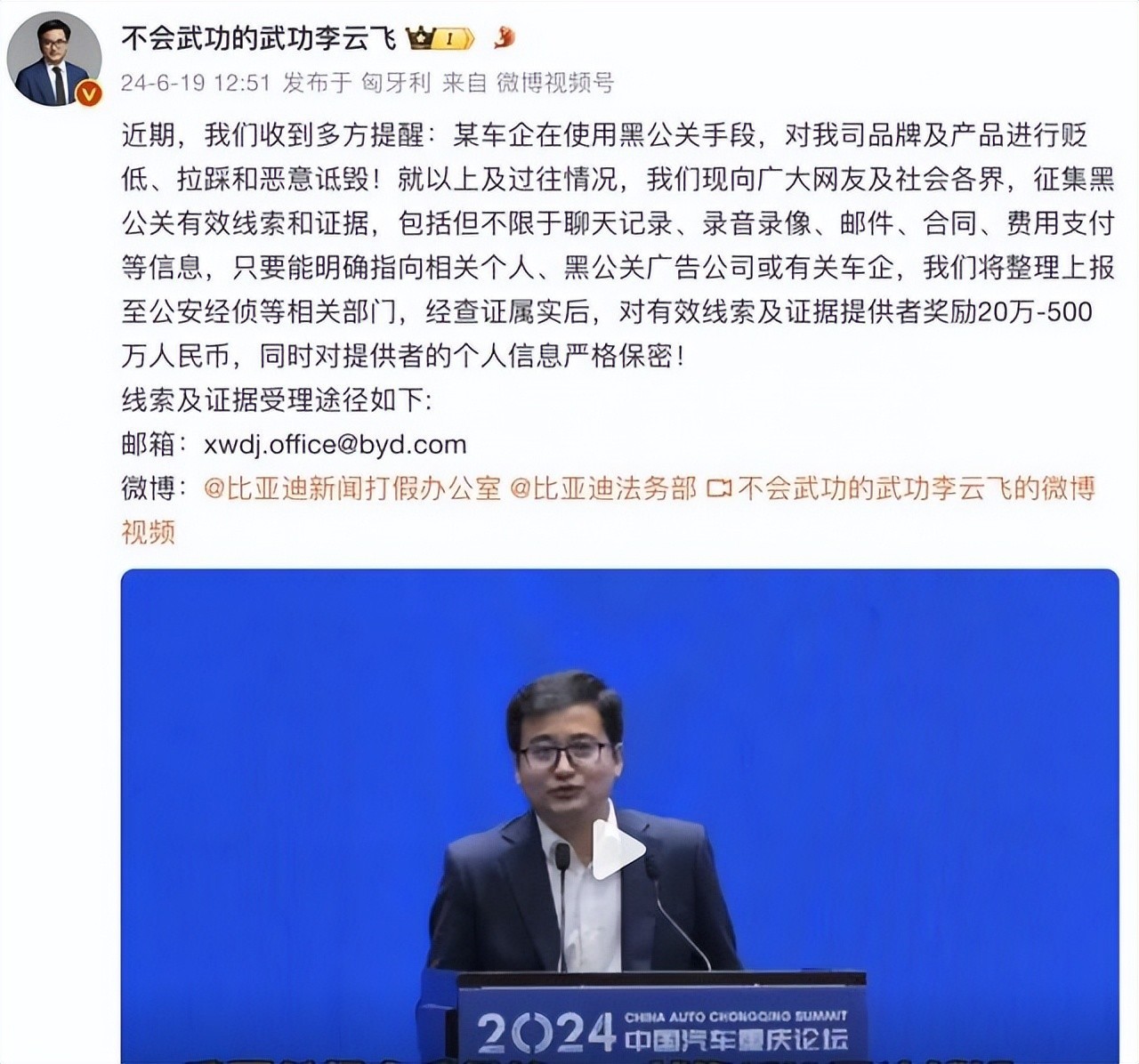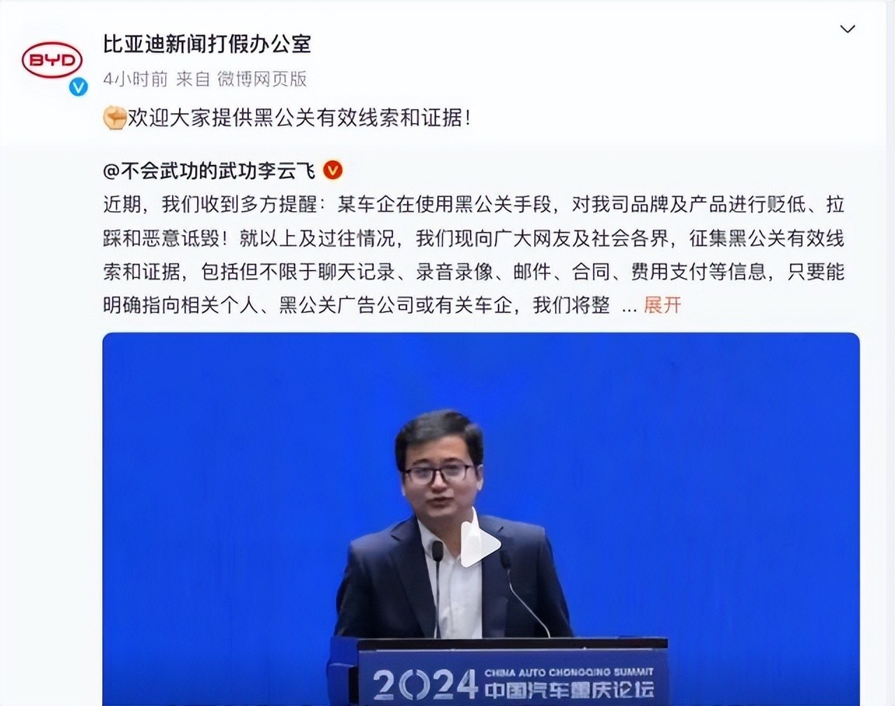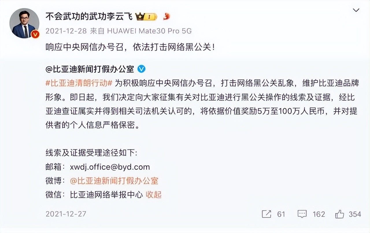 来自比亚迪品牌及公关处总经理李云飞在微博发文表示:“近期,我们收到多方提醒:某车企在使用黑公关手段,对我司品牌及产品进行贬低、拉踩和恶意诋毁。”