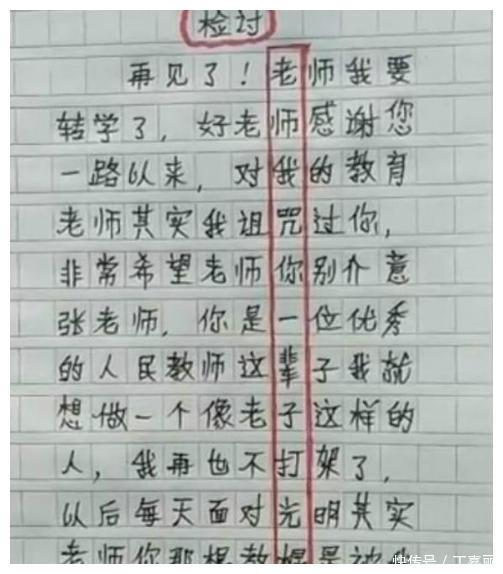 其实老师看到这样的检讨书,理应检讨一下自己的处理方式,是否公平公正,以至于让小小的孩子有这样的想法,而未来如何教导,才能让这些本来就很聪明的孩子的特点不断地变大,成为有用的人。