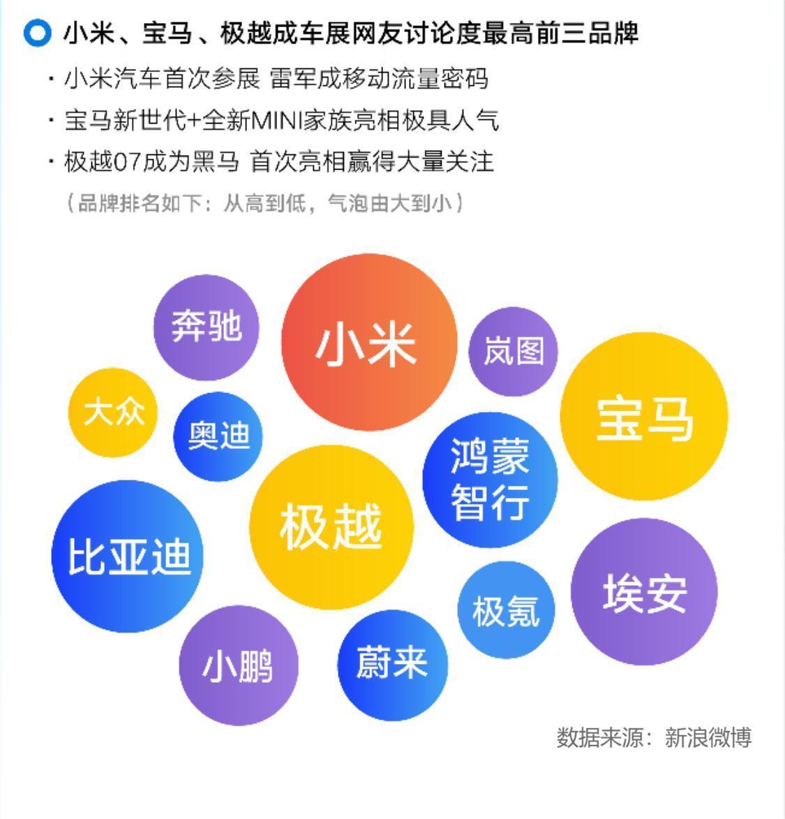 除了央视的密集报道,当红脱口秀明星笑果文化的何广智和歌星汪峰也在车展期间来到极越的展台。一波波话题和关注把极越推到了新浪微博车展期间最热门车企排行第三的位置。