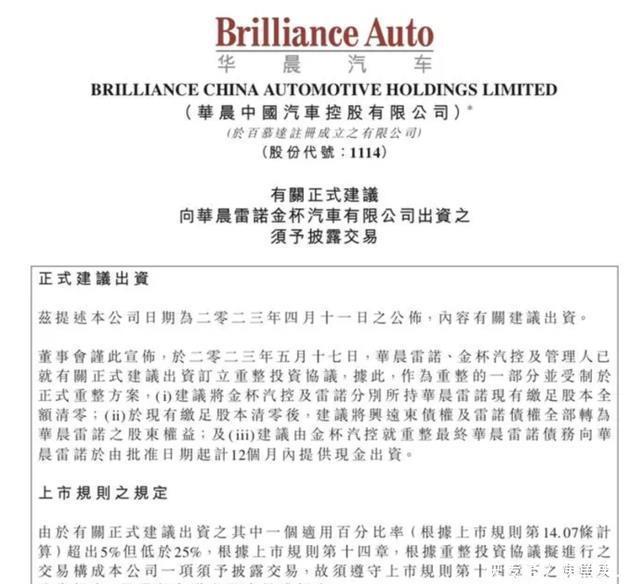 5月17日,华晨中国发布公告称,华晨雷诺、金杯汽控及获沈阳市中级人民法院委任的华晨雷诺管理人已订立正式重整投资协议。