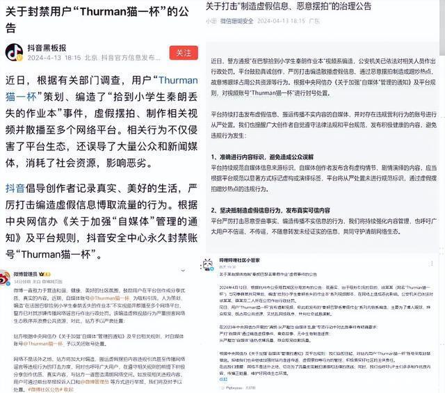 4月13日晚间,这件事终于真正大结局了,今日头条、抖音、微博、B站、微信各大平台均发布了封禁“猫一杯”账号的公告。
