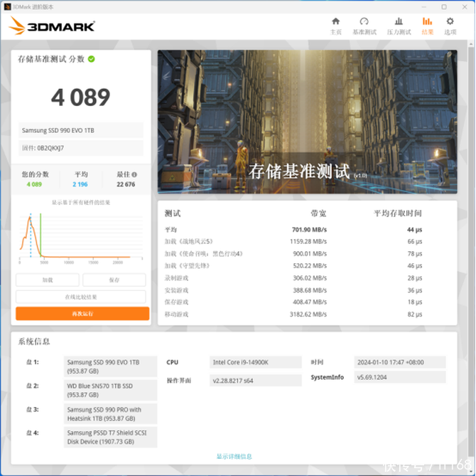 3DMARK存储基准测试中,三星990 EVO得到了4089的高分表现,平均带宽更是达到了701.90MB/s,平均存取时间也仅为44us,不论是游戏存取,读取、安装还是后期录制游戏,三星990 EVO的性能都算得上出色一档,是目前中端固态硬盘里面的高水准表现。