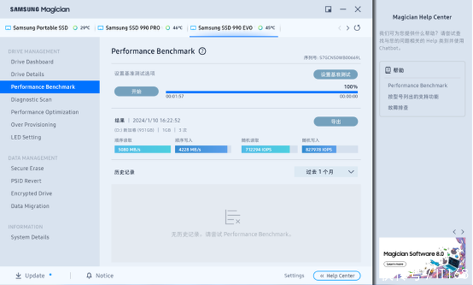 实际性能测试方面,我们选择三星魔术师8.0和CrystalDiskMark 8.0进行测试,三星990 EVO固态硬盘的性能超过官方宣称的速率,性能表现非常优秀,能够为用户带来更好的日常使用体验。